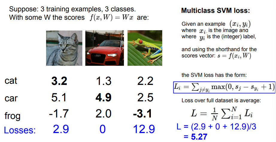 ๊ณ ์์ด ์ด๋ฏธ์ง์์ cat์ด๋ผ๊ณ ๋ถ๋ฅํ score์ธ 3.2์ car๋ผ๊ณ ๋ถ๋ฅํ score 5.1๋ก ๋ณด๋ฉด car๋ผ๊ณ ์์ธกํ score ์ ๊ฐ์ด ํฌ๋ loss ๊ฐ์ด ์ปค์ผํ๋ค๊ณ ์์ธกํ ์ ์๋ค. loss ๊ฐ์ ๊ตฌํด๋ณด๋ฉด max(0, 5.1-3.2+1) = max(0, 2.9) = 2.9