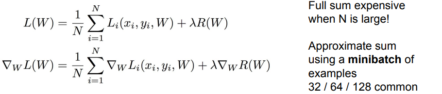 ์์์ minibatch๋ฅผ ๋ง๋ค๊ณ , minibatch ๋ด์์ loss์ gradient๋ฅผ ๊ณ์ฐํ๊ณ W๋ฅผ ์ ๋ฐ์ดํธํ๋ค.
